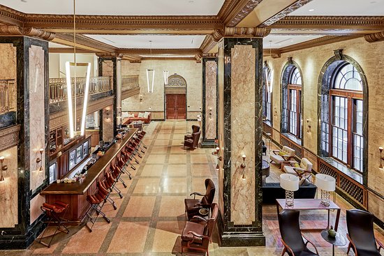 The Trade Room serves as the lobby lounge of the hotel and features a long cocktail bar with various groupings of lounge seating. The building itself was an office building years ago and the Trade Room keeps the old commerce spirit in its preserved detail. You can imagine bank tellers working along what now is a bar top.